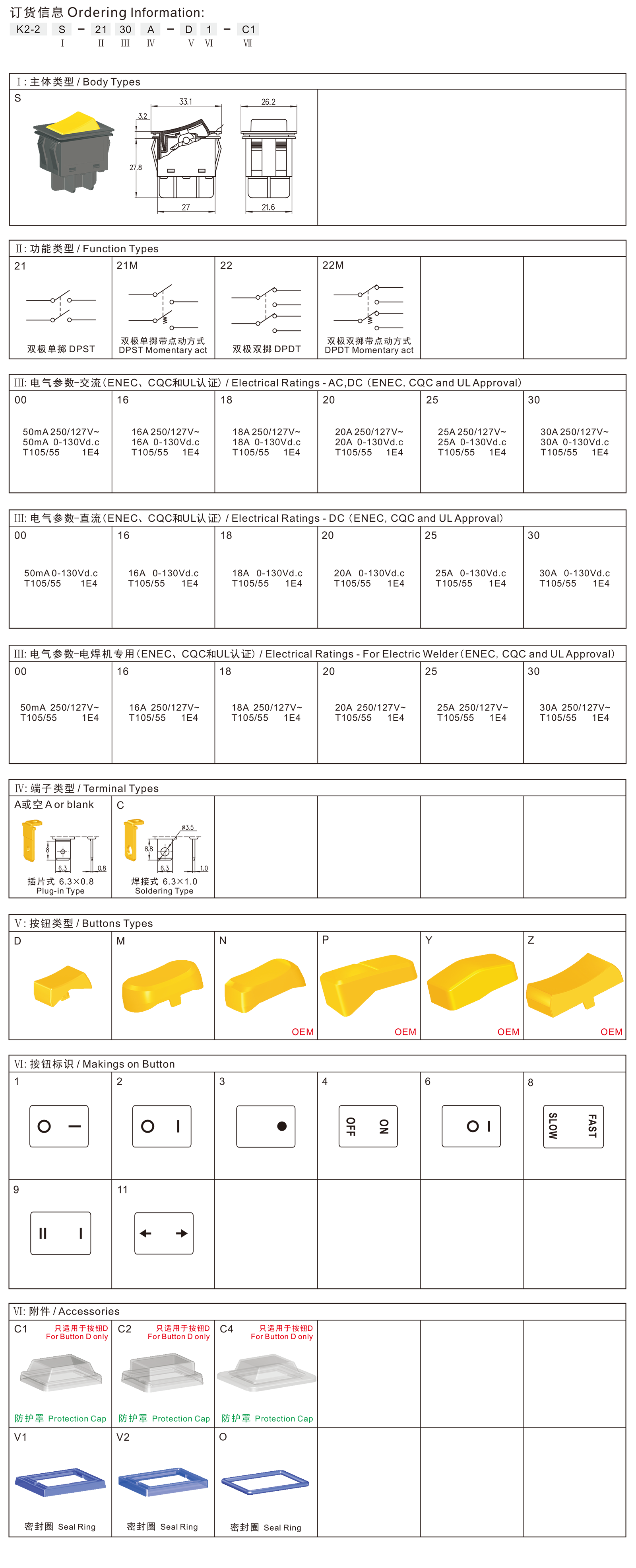 ◆K2-2S series are one standard type rocker switches, optional many kinds of types, optional with Protection Cap for dustproof and waterproof, or with Inner Protection Structure for dustproof and waterproof, specially for used in DC high rated power tools and gardening tools such as: Cordless Bench Grinders, Cordless Electric Lawnmowers, Cordless Electric High Pressure Washers, etc. Also for used in AC or DC Electric Welder, etc.