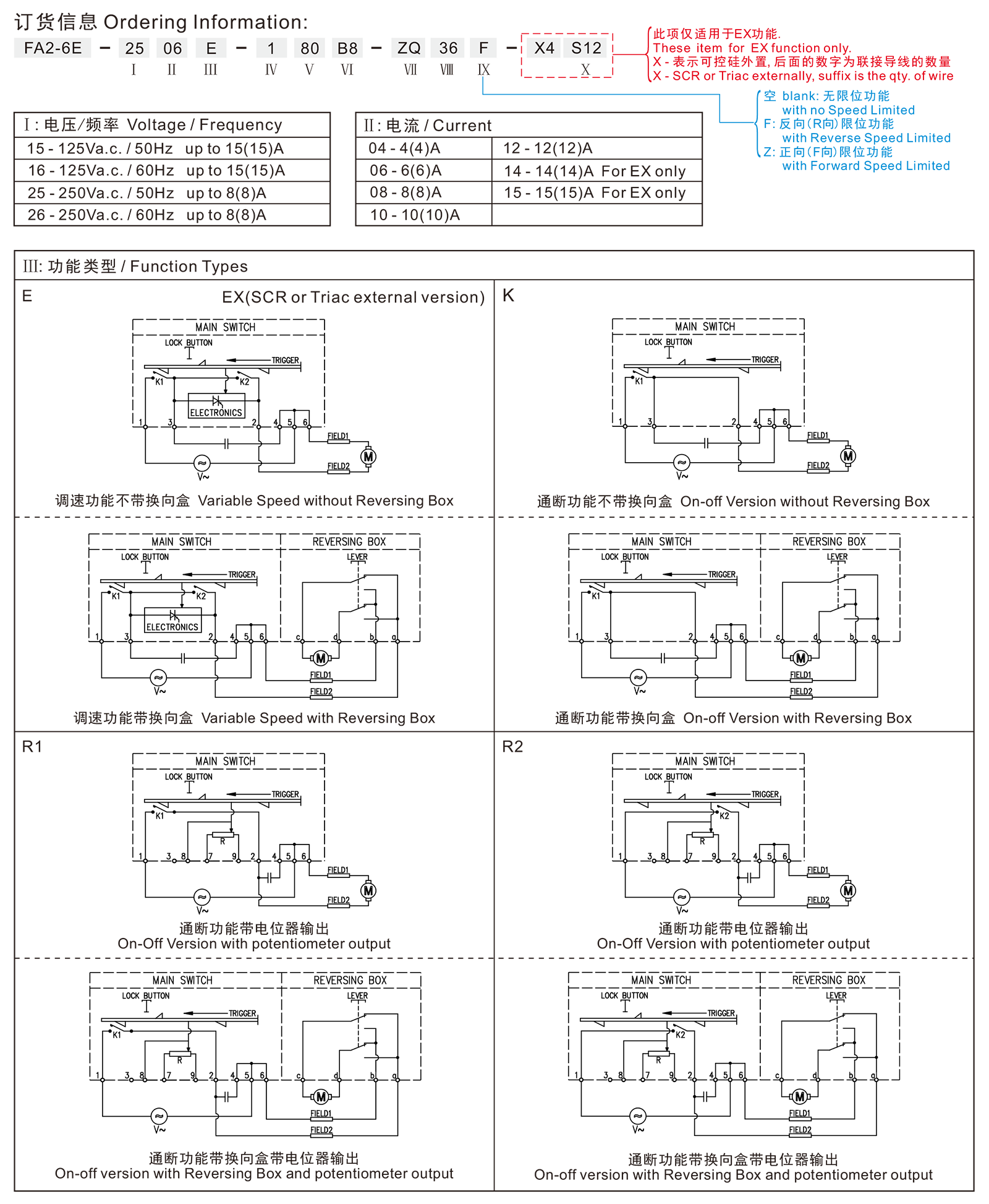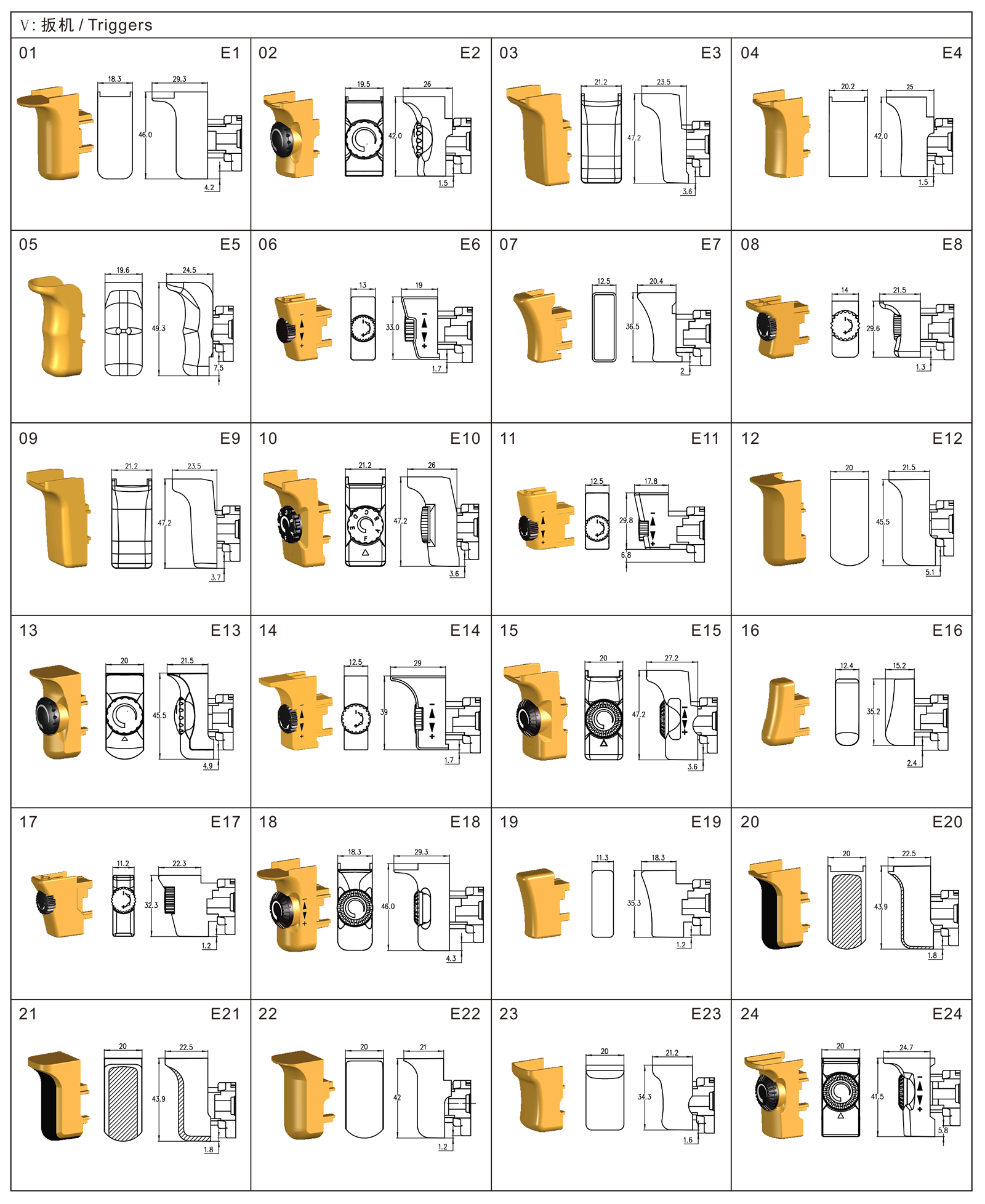 FA2-6E series are general type multi-speed trigger switches with by-pass contact, integrated dustproof, are popular for used in portable power-tools such as: Electric Drills, Impact Drills, Jig Saws, Electric Hammers, Reciprocating Saws, Grinder Polishers, Sanders, etc.