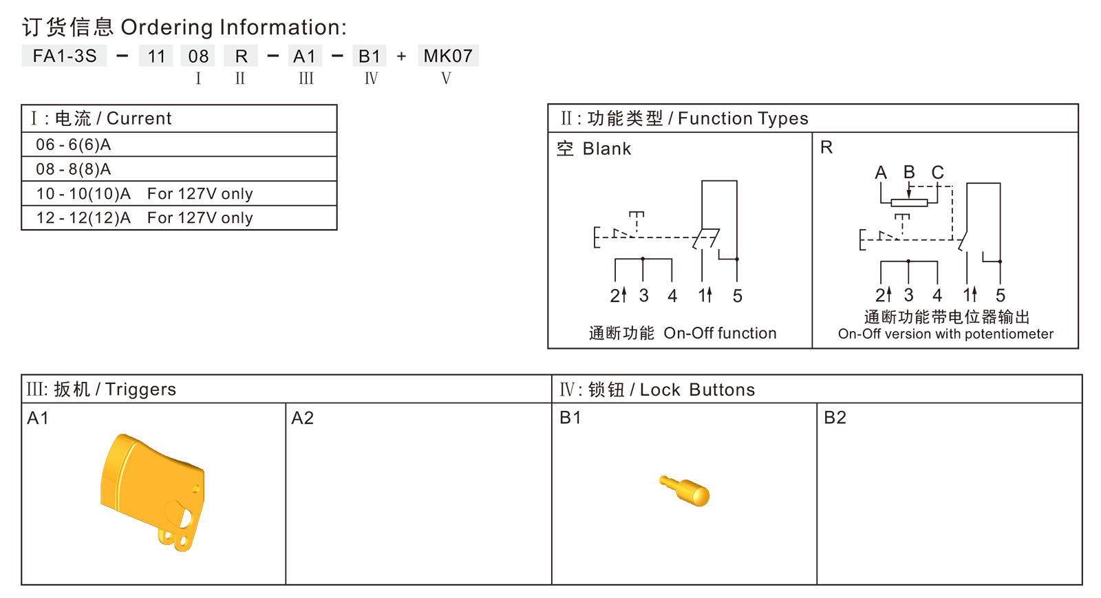 ◆FA1-3S系列是一款专用型扳机开关,集成防尘功能,带通断和电位器输出功能,可以和MK07调速线路板进行配套,应用于各类电动工具,如:150mm角磨机和抛光机等。开关扳机和锁钮可根据客户要求进行定制,线路板组件功能可以任意进行调节。