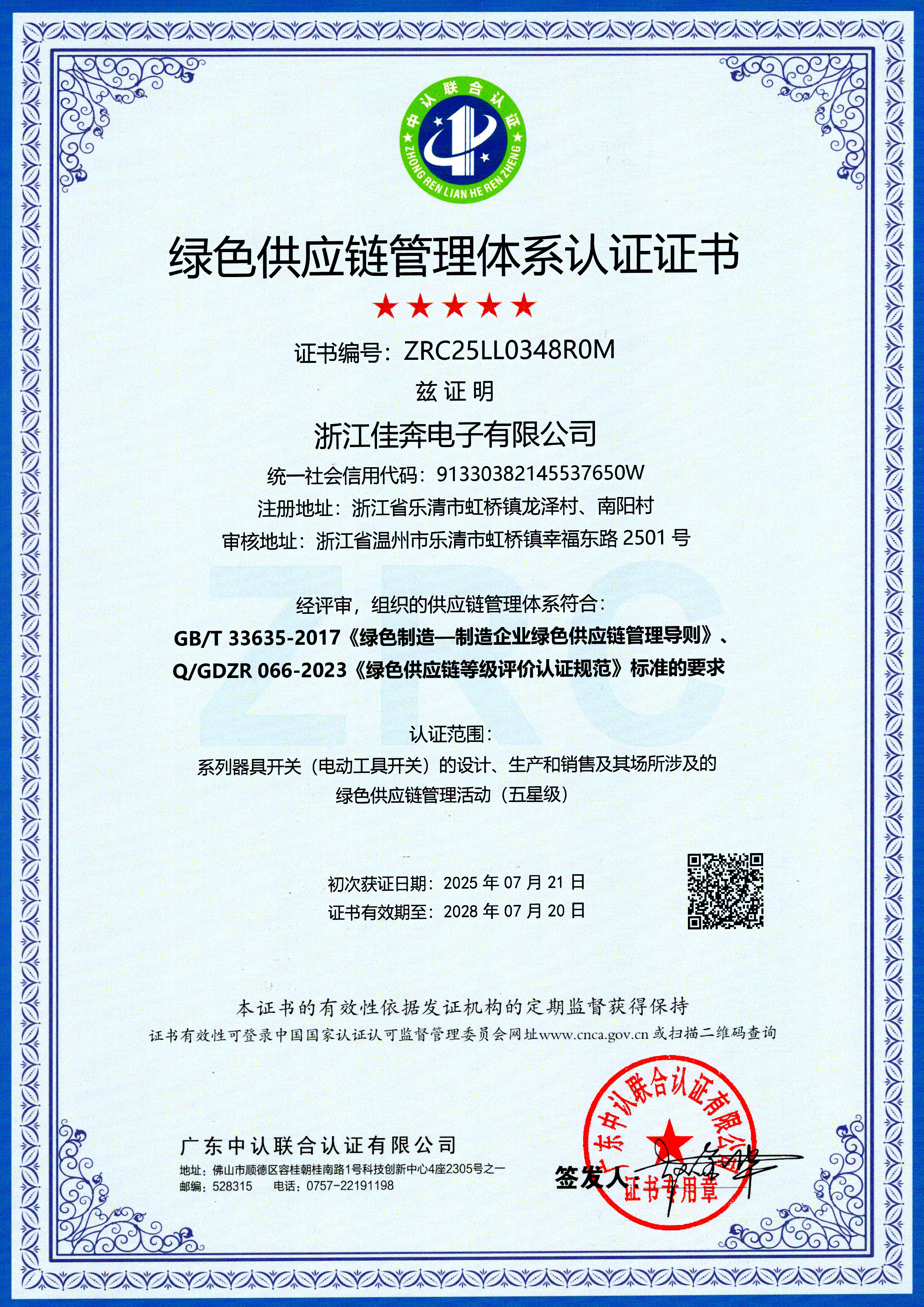 2025年7月21日,公司获得绿色供应链管理体系认证证书,为后续绿色制造奠定基础。