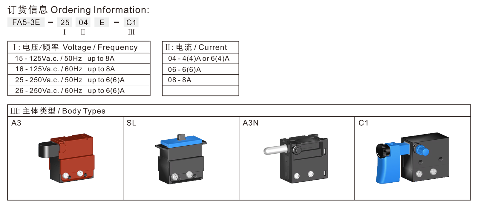 FA5-3E series are one general type variable speed trigger switches with by-pass contact, for popular used in portable power-tools such as: Electric Drills, Rotary Hammers, Jig Saws, Foot Variable Speed Switches, etc.