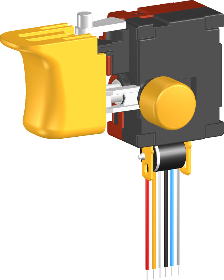 DPK系列是一款通用型的直流扳机开关,集成防尘机械刹车接点,内部带换向结构,应用于各类直流充电式手持电动工具,如:充电式电钻、充电式电锤、充电式电圆锯、充电式螺丝起子、充电式冲击扳手等,也可应用各类直流无刷电动工具。