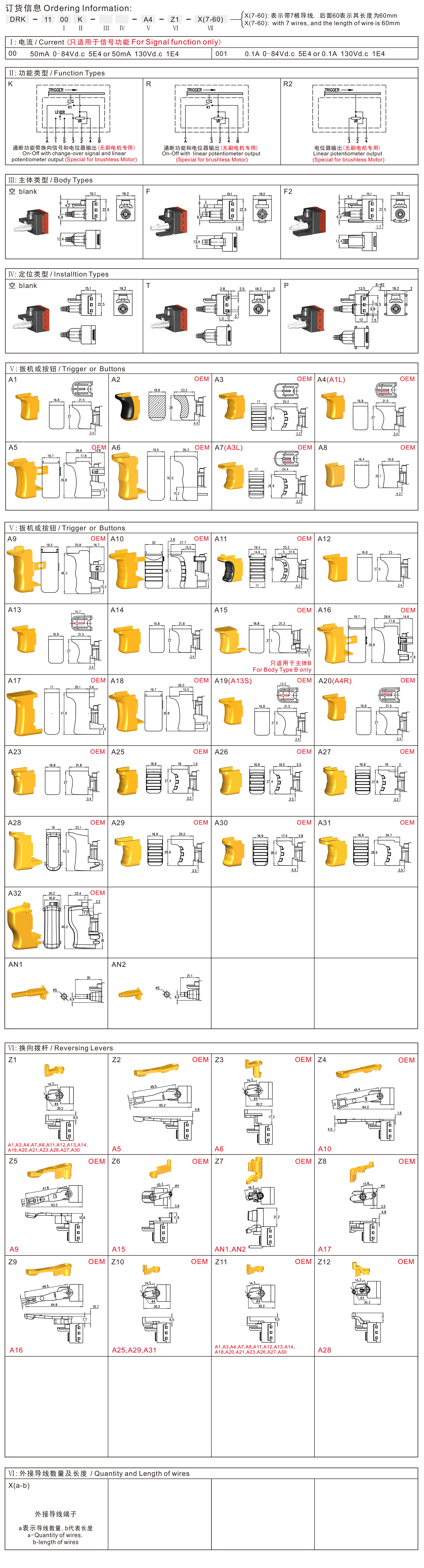 DRK series are one special type DC signal trigger switches, integrated dustproof (and waterproof), designed specially for used in Brushless DC power-tools or Gardening Tools such as: Brushless Cordless Drills, Brushless Cordless Hammers, Brushless Cordless Screw Drivers, Brushless Cordless Impact Wrenches, Brushless Cordless Blowers, etc.