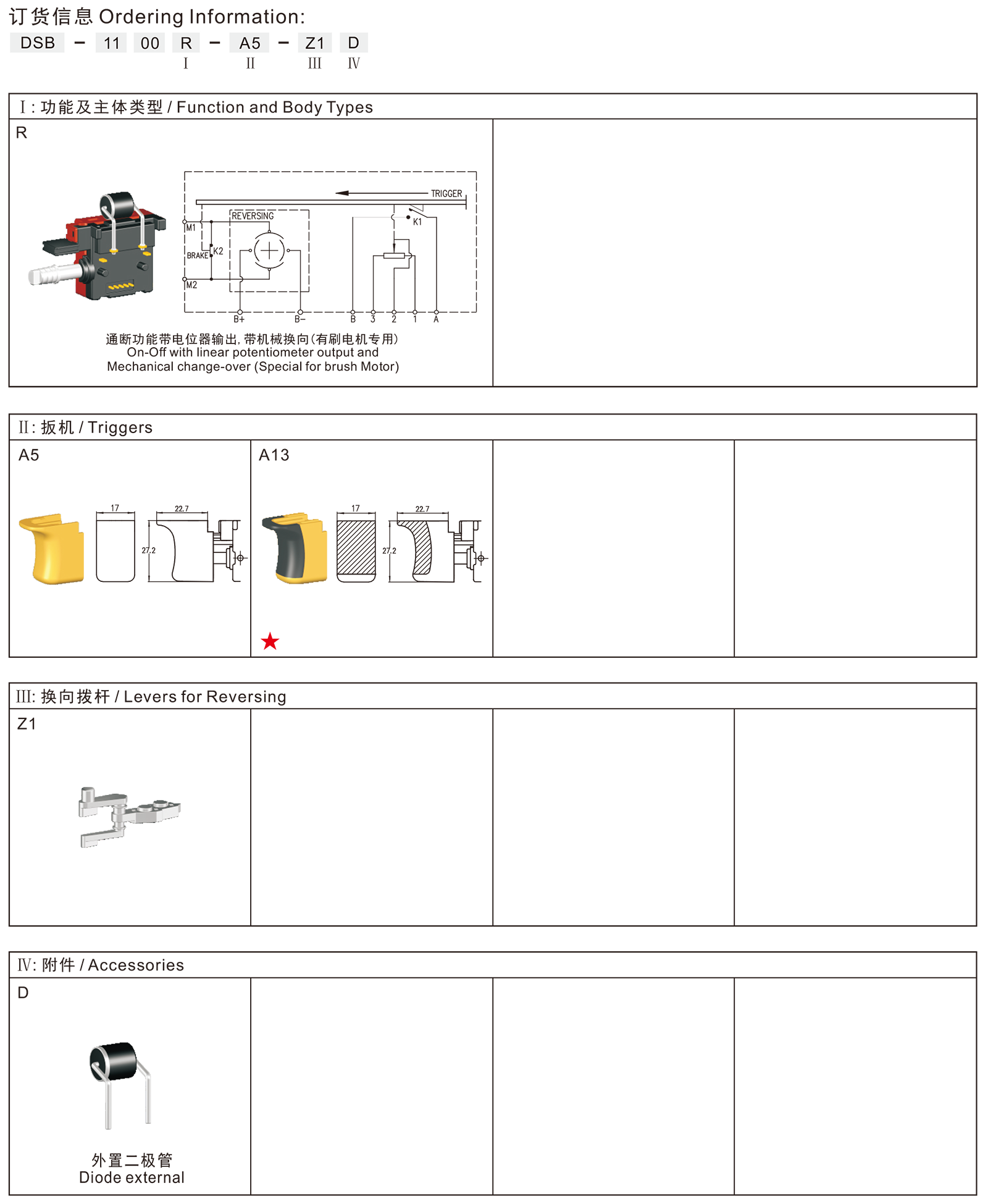 ◆DSB series are one special type DC signal trigger switches, integrated dustproof and me chanical brake contact, specially for used in DC power-tools such as: Cordless Drills, Cordless Screw Drivers, Cordless Impact Wrenches, etc. With special design for assembly with PCB, needn't any wires.