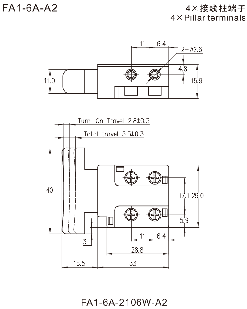 →2×接线柱端子 Pillar terminals φ=2.6mm or 2.8mm