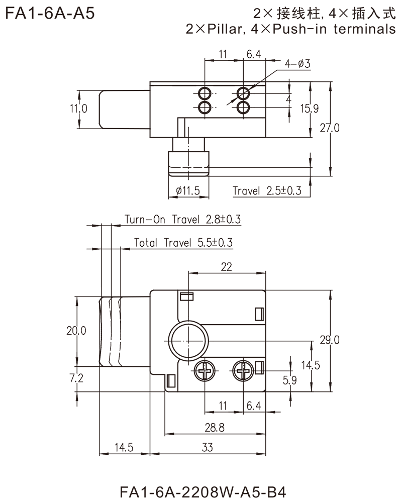 →2×接线柱端子 Pillar terminals φ=2.6mm or 2.8mm