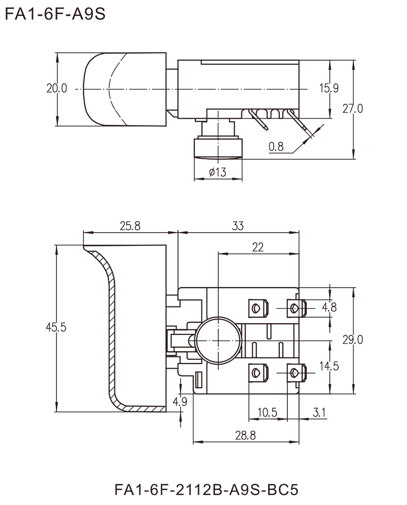 FA1-6F series are general type trigger switches, integrated dustproof, commonly for used in portable power tools such as Electric Drills, Rotary Hammers, Reciprocating Saws, Jig Saws, Angle Grinders, Electric Mixers, Cut-Off Machines, Marble Cutters, Electric Routers, Circular Saws, Belt Sanders, Orbit Sanders, Polishers, Electric Planers, Electric Sprayers, Electric Nailers, etc. Besides, they are also suitable for power gardening tools, such as Grass Trimmers, Electric Chain Saws, Electric Lawnmowers, Electric Snowthrowers, etc.