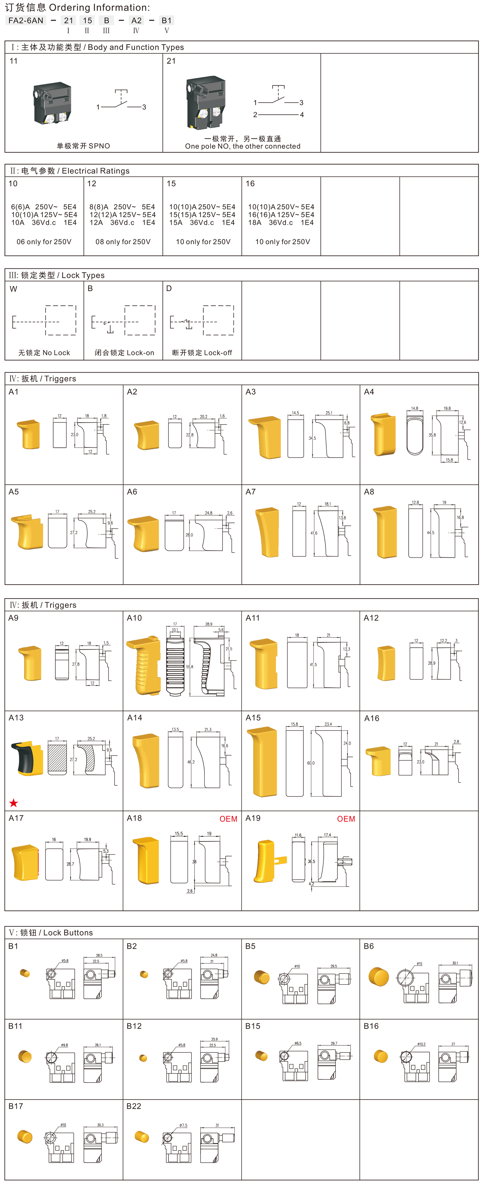 FA2-6AN系列是一款通用型的扳机开关,为FA2-6A系列的防尘改进款,广泛应用于各类手持式电动工具和园林工具,如:电钻、云石机、电圆锯、电木铣、砂带机、砂光机、电刨、电链锯等。