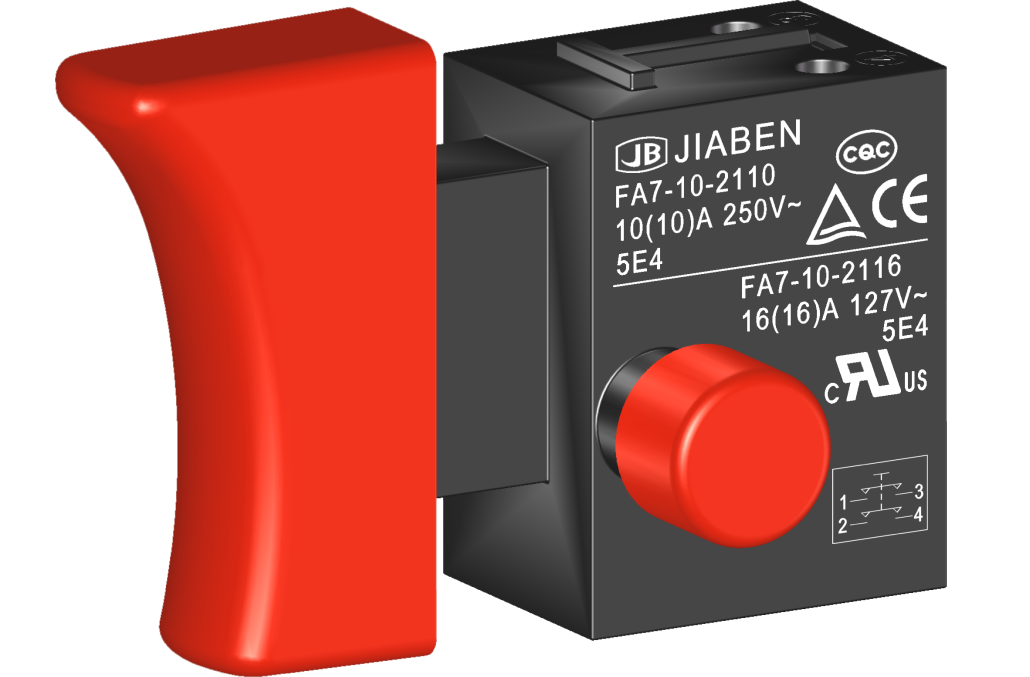 FA7-10 series are one general type trigger switch, with snap-action structureoptional integrated dustproof, for used in power-tools and gardening tools such as Electric Mixers, Circular Saws,Jig Saws, Polishers Grinders, Electric Planers, Rotary Hammers, Demolition Hammers, Miter Saws, Cut-off Machines, Electric Chain Saws, Electric Lawnmowers, etc.