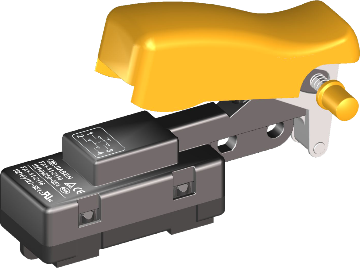FA1-10C, FA1-11 series are general type high rated trigger switches, integrated dustproofwith snap-action structure, for used in high rated bench-top, portable power-tools and gardening tools such as Cut-off Machines, Miter Saws, 150mm, 180mm and 230mm Large Angle Grinders, Polishers, Circular Saws, Rotary Hammers, Demolition Hammers, Electric Chain Saws, etc.