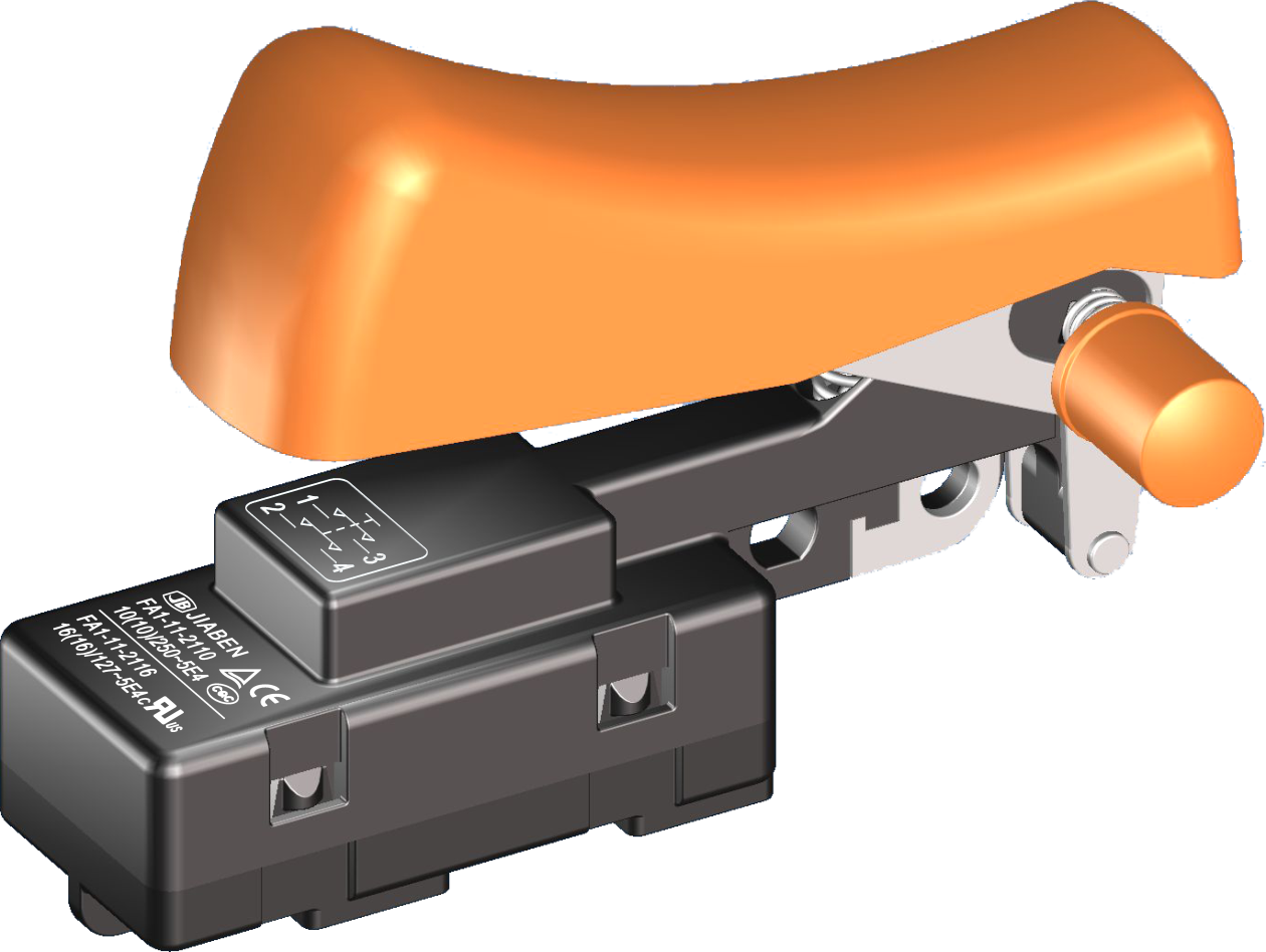 FA1-10C, FA1-11 series are general type high rated trigger switches, integrated dustproofwith snap-action structure, for used in high rated bench-top, portable power-tools and gardening tools such as Cut-off Machines, Miter Saws, 150mm, 180mm and 230mm Large Angle Grinders, Polishers, Circular Saws, Rotary Hammers, Demolition Hammers, Electric Chain Saws, etc.