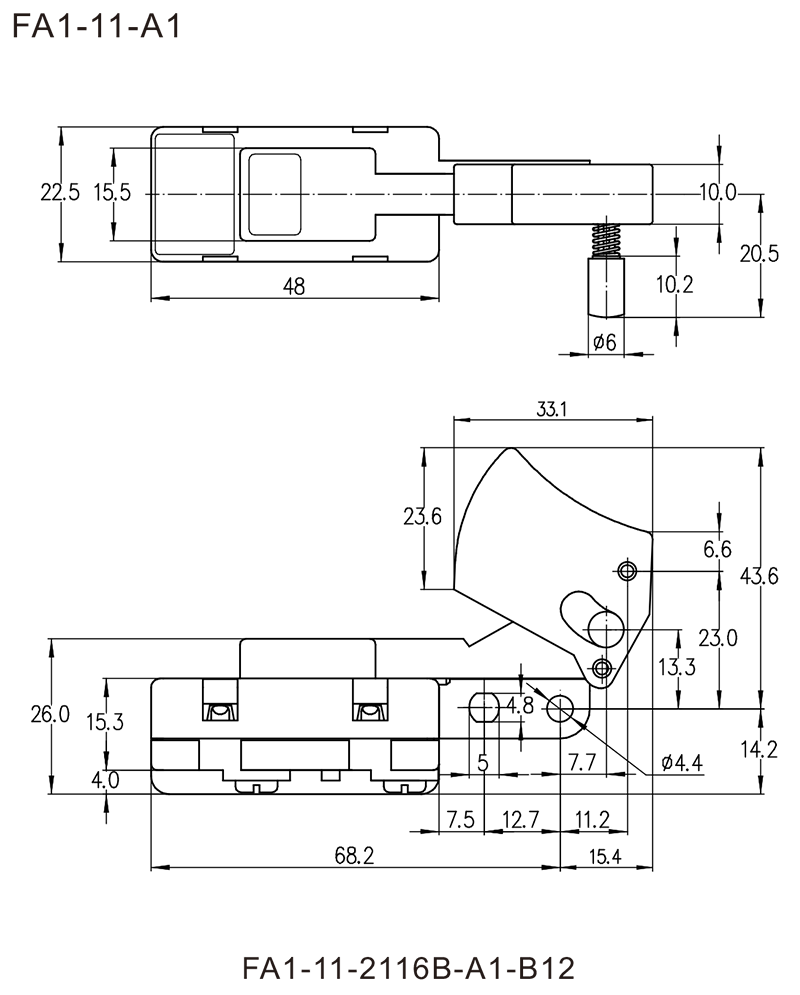 FA1-10C, FA1-11 series are general type high rated trigger switches, integrated dustproofwith snap-action structure, for used in high rated bench-top, portable power-tools and gardening tools such as Cut-off Machines, Miter Saws, 150mm, 180mm and 230mm Large Angle Grinders, Polishers, Circular Saws, Rotary Hammers, Demolition Hammers, Electric Chain Saws, etc.