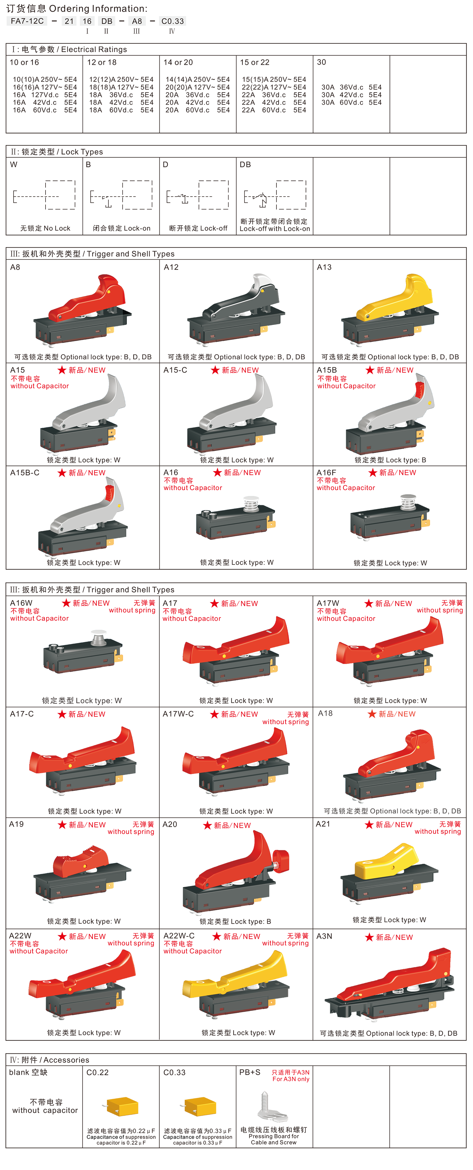 with snap-action structure, for use in high rated bench top or portable power-tools such as Cut-off Machines,Miter Saws, 125mm and 150mm Angle Grinders, Rotary Hammers, Demolition Hammers, etc. These switch has more than 10 body and trigger types for customer's choice, also accept customize according to customer's request.