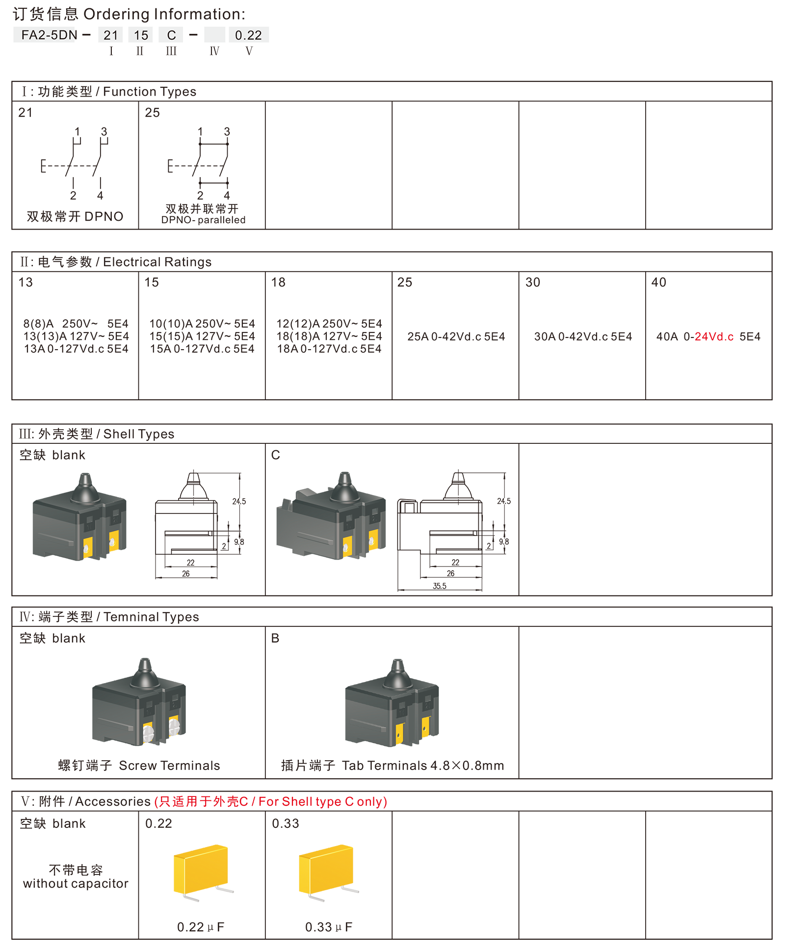 ◆FA2-5DN series are special type Push-button switch, integrated dustproof, with snap-action structure, for used in portable power-tools such as 125mm and 150mm Angle Grinders, Polishers Grinders, etc.