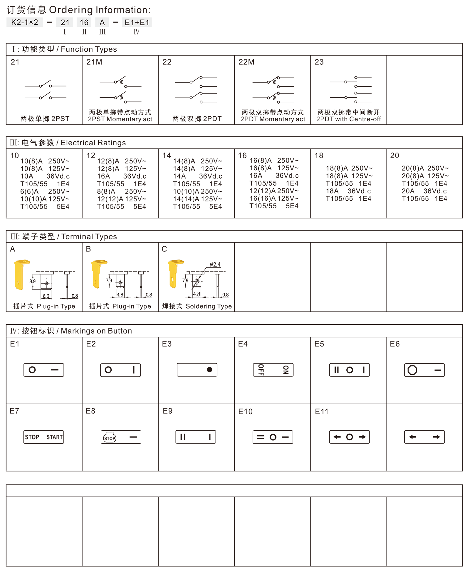 ◆K2-1x2系列是一款标准型的跷板开关,也通称船型开关、波形开关等,用途极广,广泛应用于各类家用电器及办公设备,如:电扇、饮水机、取暖器等。