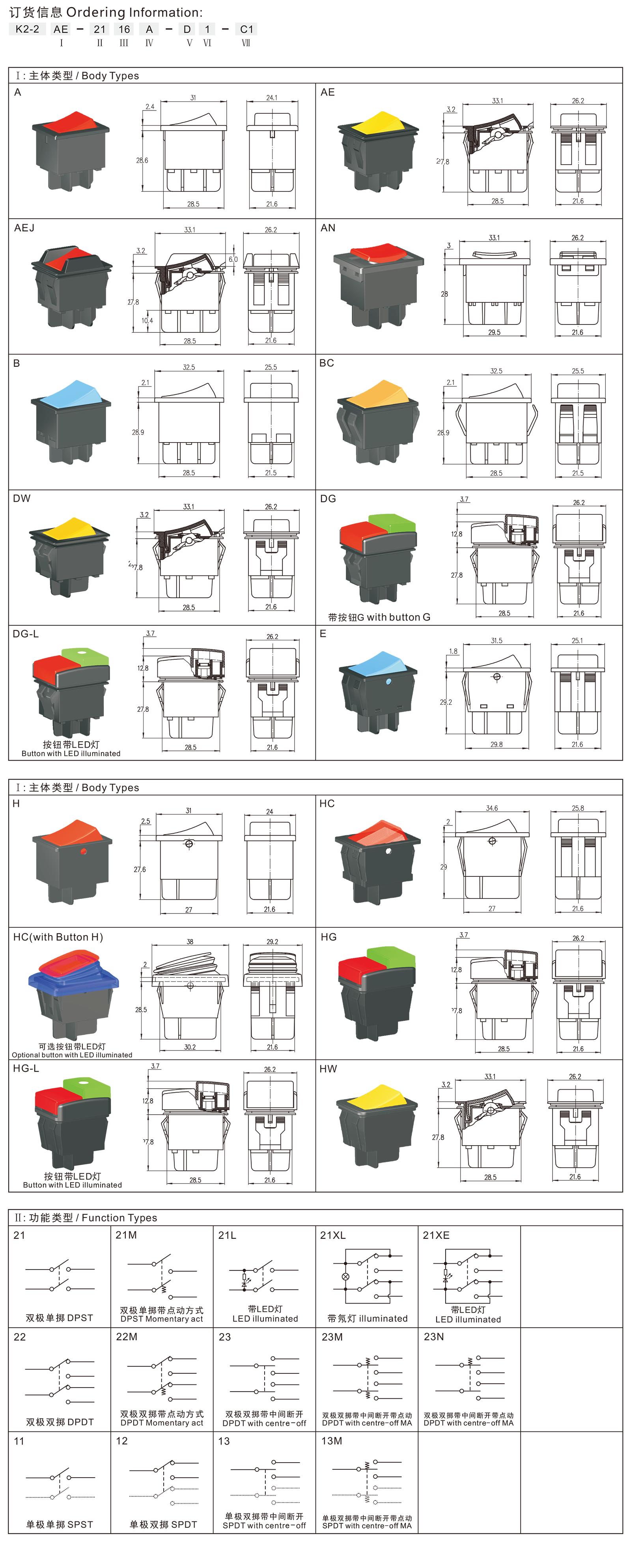 K2-2系列是一款标准型的跷板开关,也通称船型开关、波形开关等,有多种款式可以选择,可选带防护罩实现防尘防水,也有内部防尘结构来实现防尘防水,用途极广,广泛应用于各类电动工具、园林工具和清洁器具,如:台锯、台式砂轮机、电动割草机、树枝粉碎机、高压清洗机、干湿两用吸尘器等,也同样适用于各类家用电器、仪器及办公设备等。