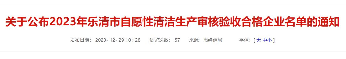 各有关企业: 根据温州市经信局《关于组织开展2023年自愿性清洁生产审核企业和节水型企业推荐工作的通知》文件要求及2023年乐清市自愿性清洁生产计划安排,乐清市经信局组织开展了2023年清洁生产项目创建工作,其中火炬电气集团有限公司等34家企业通过审核验收,取得了清洁生产阶段性成果。 希望通过清洁生产审核验收的企业再接再厉,持续开展清洁生产,为我市全面推行清洁生产绿色制造,完成节能减排任务,发展循环经济,推动生态文明建设做出表率。 附件:2023年乐清市自愿性清洁生产审核验收合格企业名单