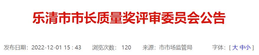 2022年4月,乐清市市长质量奖评审委员会启动了2022年乐清市市长质量奖评审工作,按照《乐清市市长质量奖评审管理办法》的程序规定,在企业自愿申请的基础上,经有关镇人民政府、街道办事处推荐,乐清市市长质量奖评审委员会办公室资格审查,乐清市市长质量奖评审专家组资料评审和现场评审,乐清市市长质量奖评审委员会全体成员会议审议表决,提出了2022年乐清市市长质量奖初选授奖企业公示名单(见附件),现向社会公布,限期征求意见,接受社会各方面监督。