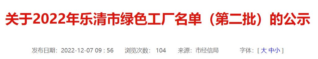 为加快全市工业领域碳达峰碳中和进程,促进工业高质量绿色发展,根据《关于开展2022年乐清市绿色工厂创建的通知》,乐清市经信局组织开展了2022年乐清市绿色工厂项目创建工作,现对验收合格企业名单公示如下(详见附件)。如有异议,请在公示期间内与我们联系,并提交相关证明材料。