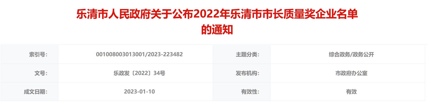 为引导和激励全市企业加强质量管理,提高经营绩效,促进高质量发展,根据《乐清市市长质量奖评审管理办法》相关规定,通过企业自愿申报、市级部门资格审查、专家组资料评审及现场评审、评审委员会审议、社会公示等环节,经市政府研究决定,俊郎电气有限公司、浙江金桥铜业科技有限公司、浙江科博电器有限公司、万博3.0安卓客户端下载等4家企业为2022年乐清市市长质量奖企业。
